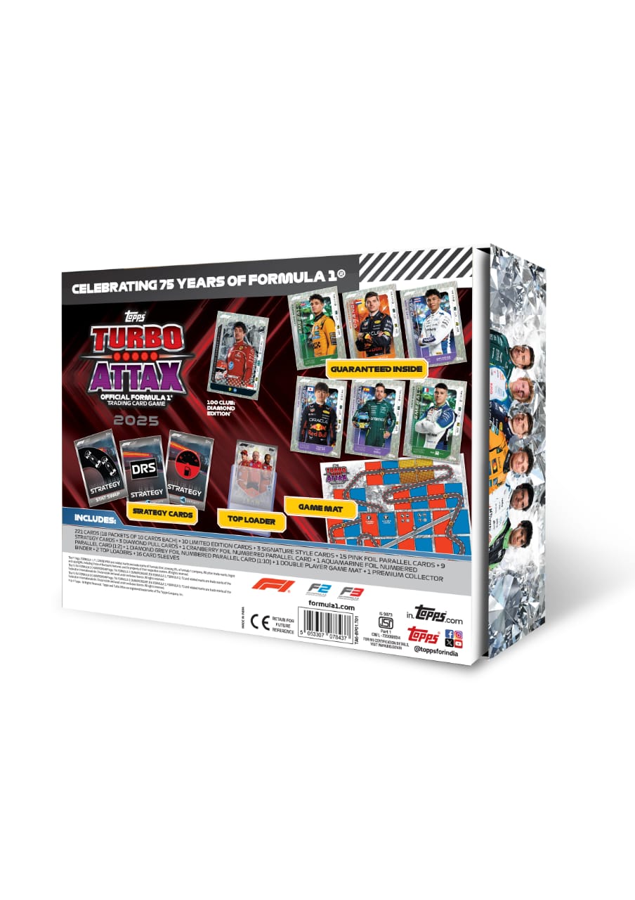 The BONANZA BOX from Topps India is the ultimate F1 Turbo Attax 2025 collector’s bundle – packed with over 220 cards plus premium collector’s accessories to store and showcase your hits.