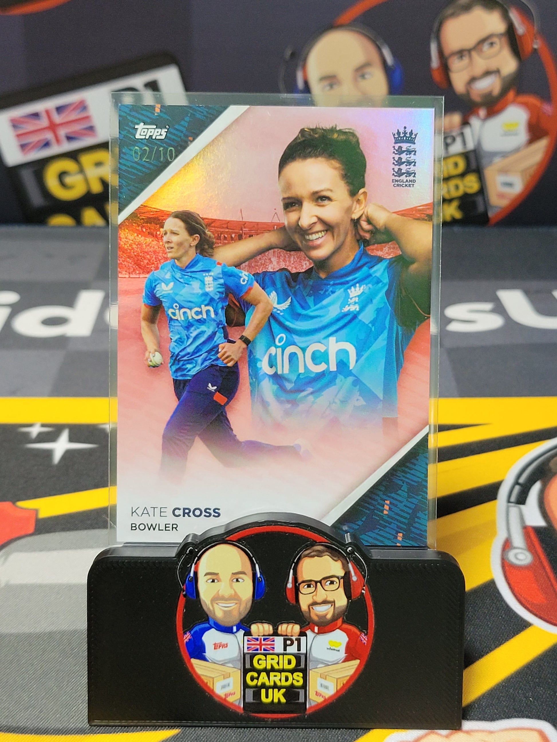 Serial numbered parallel card of Kate Cross (2/10 Red) from the Topps England Cricket Set 2024. Seam bowler for England's women's team, bringing experience and consistency.