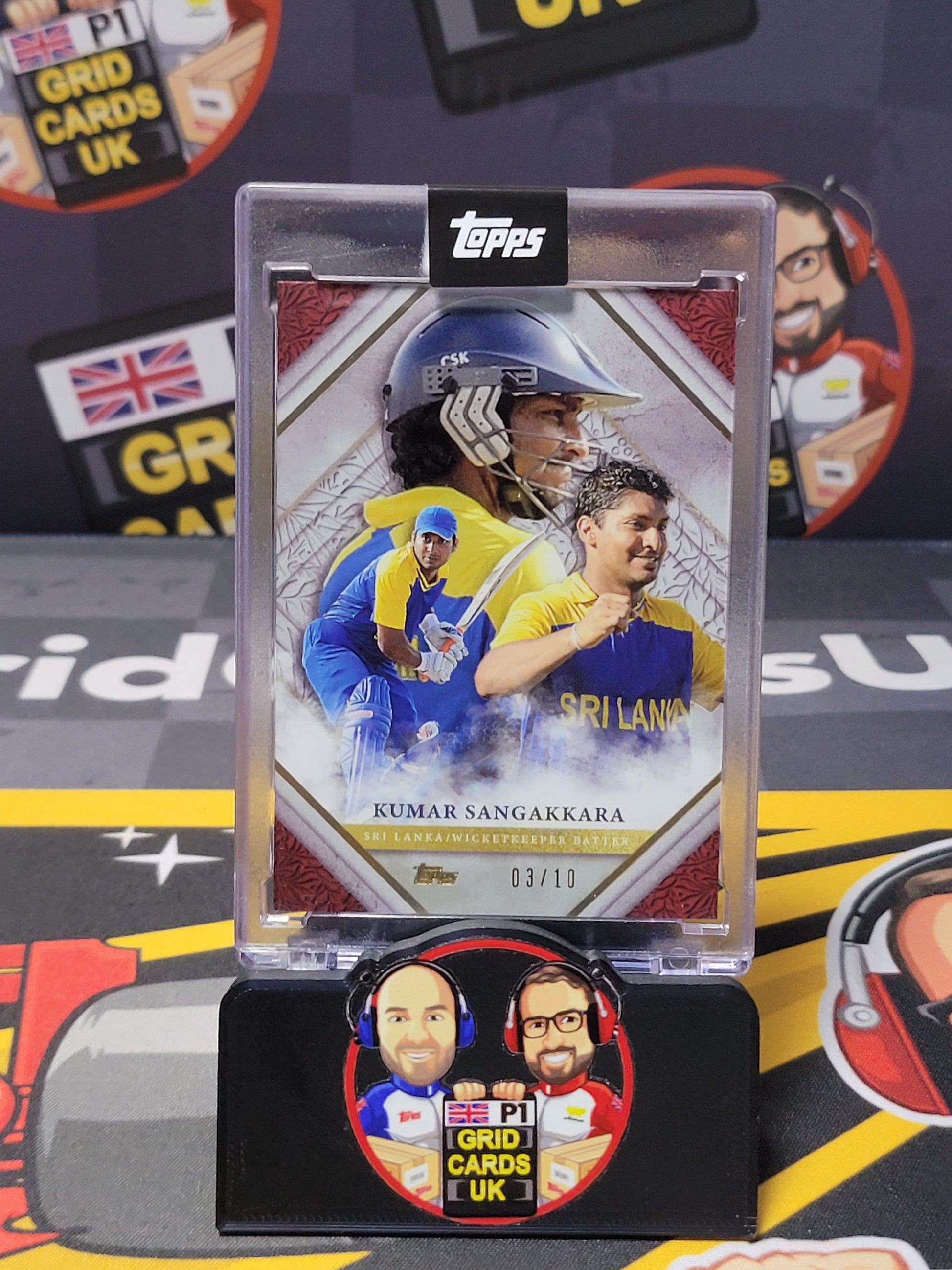 Serial numbered parallel card of Kumar Sangakkara (3/10 Red) from the Topps Cricket Legends 2024. Sri Lankan legend and stylish left-hander.