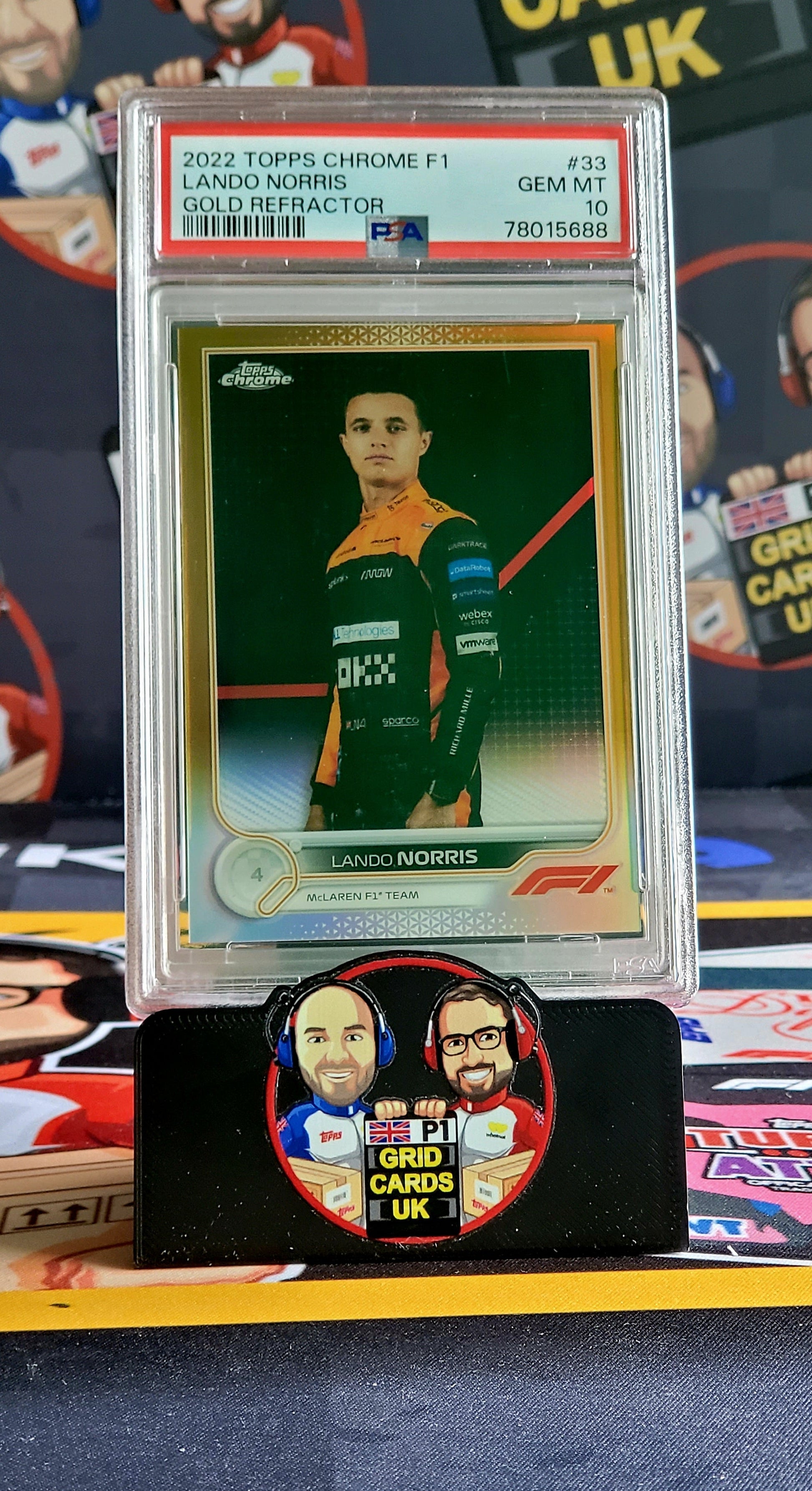 2022 Topps Chrome F1 Gold /50 of Lando Norris, PSA 10. McLaren’s star driver in an eye-catching limited print.