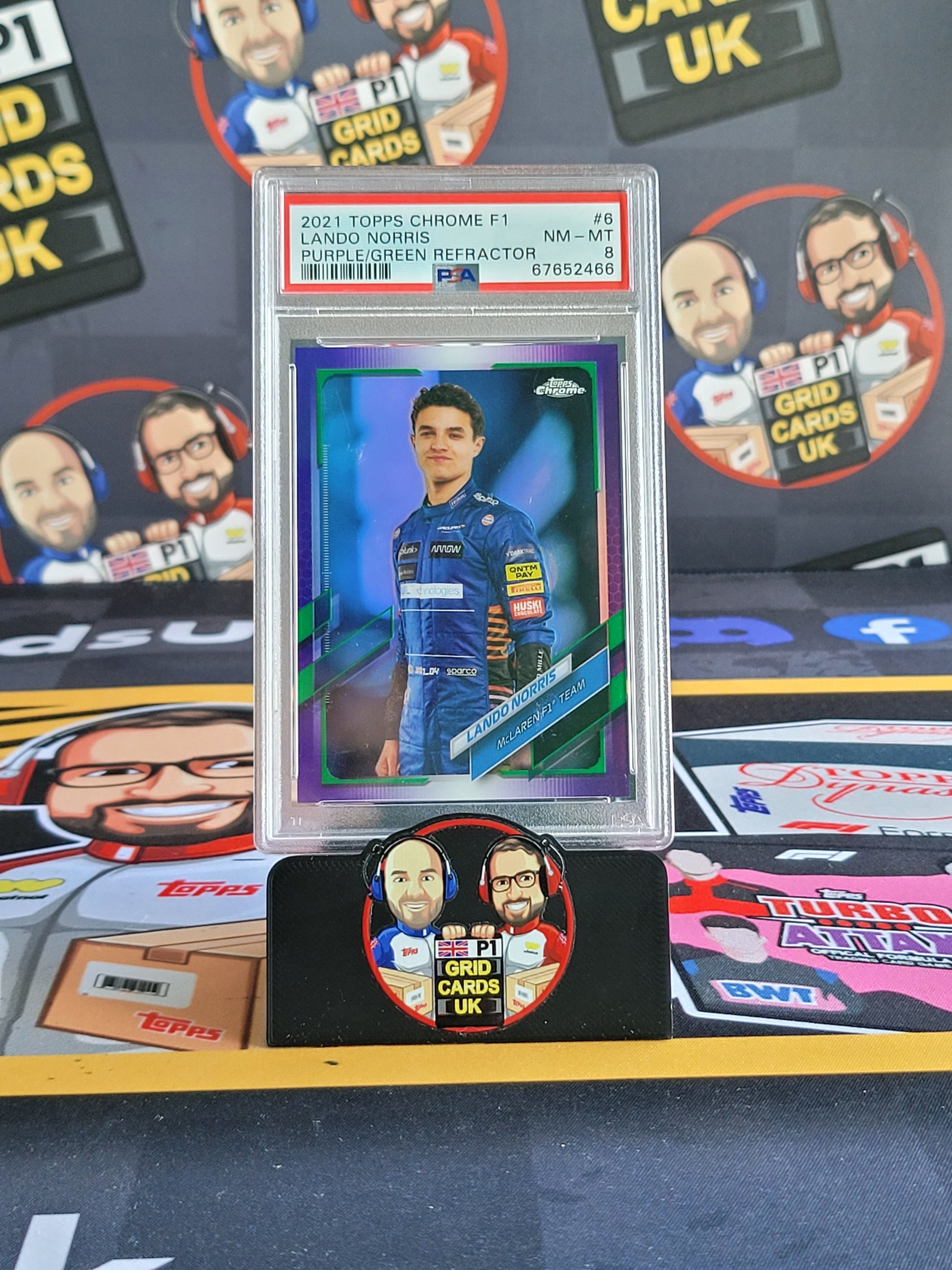 2021 Topps Chrome F1 Purple/Green Refractor of Lando Norris, PSA 8. Vivid color match for the charismatic racer.