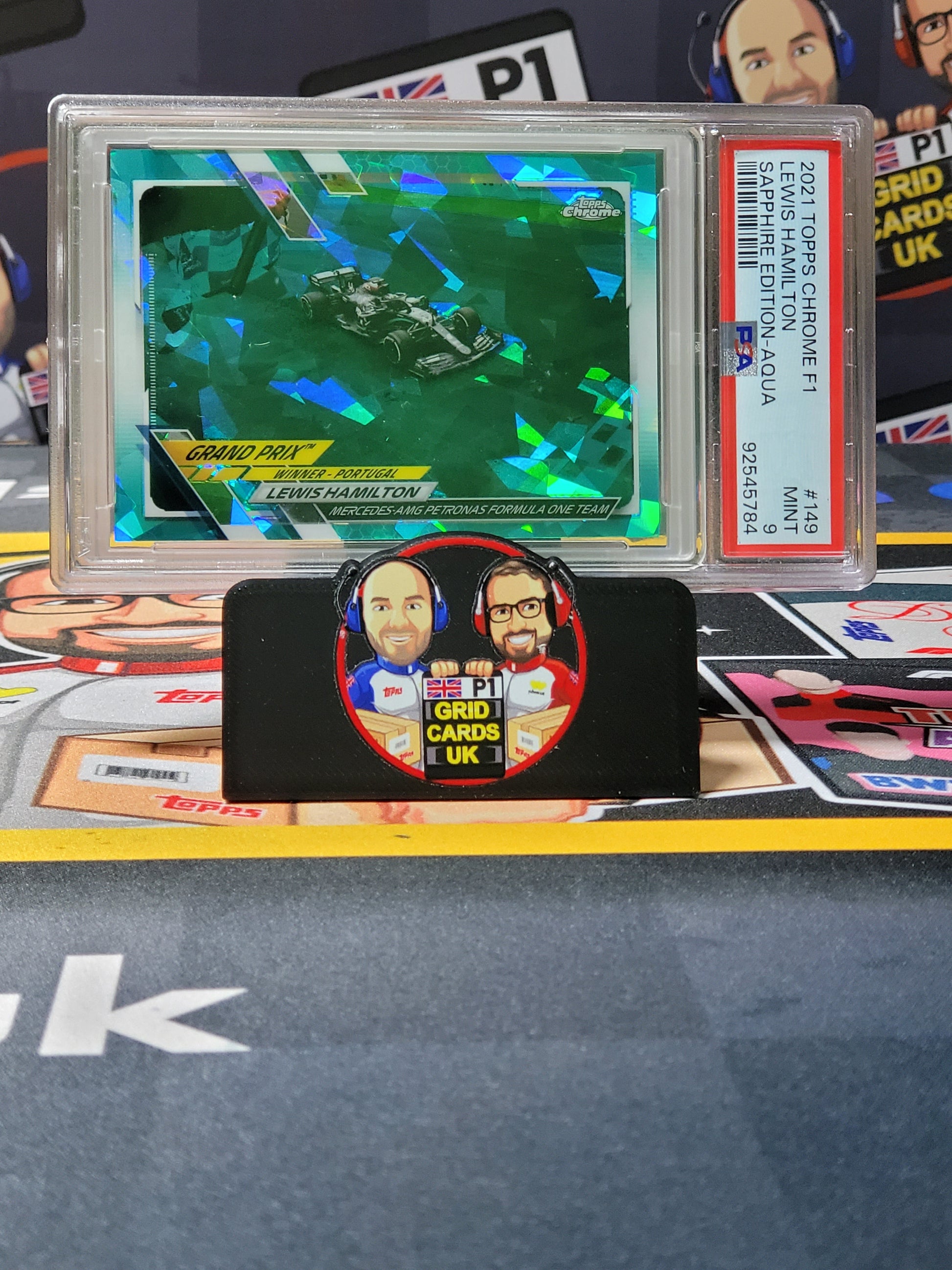 2021 Topps Sapphire F1 Aqua /99 of Lewis Hamilton, PSA 9. Premium parallel of Mercedes’ record-breaking racer.