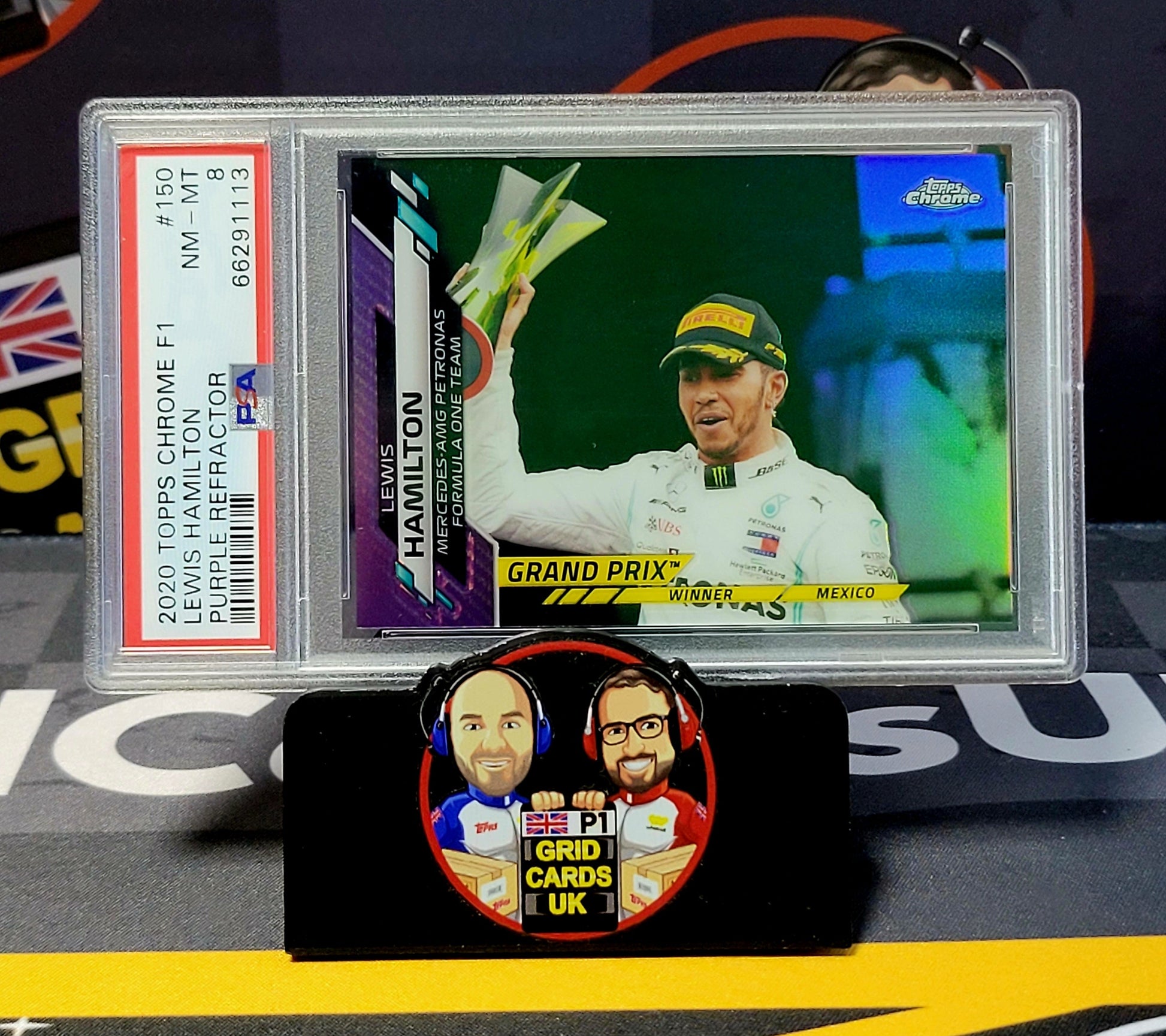 Serial-numbered /399 Purple Refractor of Lewis Hamilton, graded PSA 8. First-year Topps Chrome F1 parallels are highly sought after.