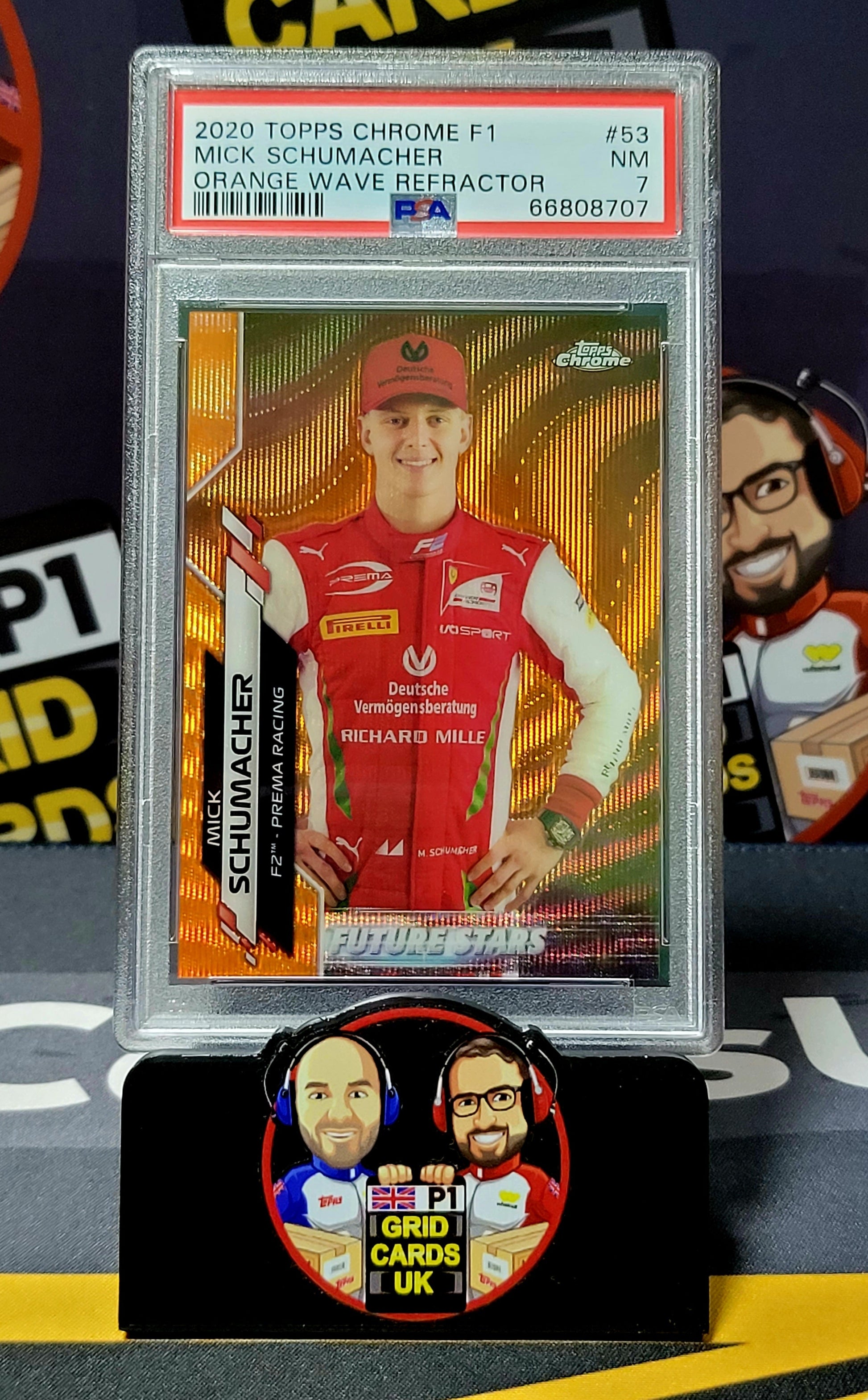 /25 Orange Wave parallel of Mick Schumacher rookie card from 2020 Chrome. PSA 7. Rare numbered rookie of the son of F1 legend Michael Schumacher.