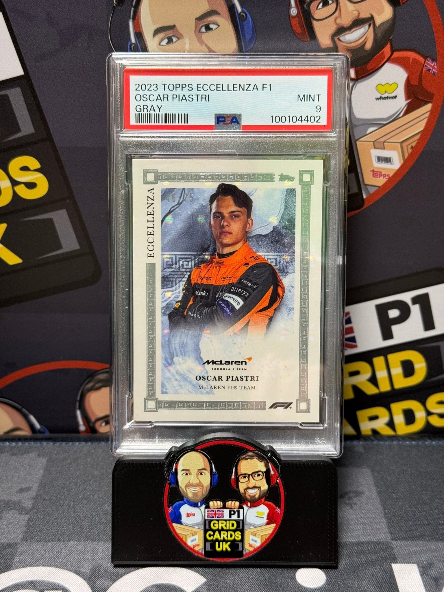 Rookie Portrait Grey /75 of Oscar Piastri from Eccellenza 2023, PSA 9 mint. Strong McLaren rookie collectible.