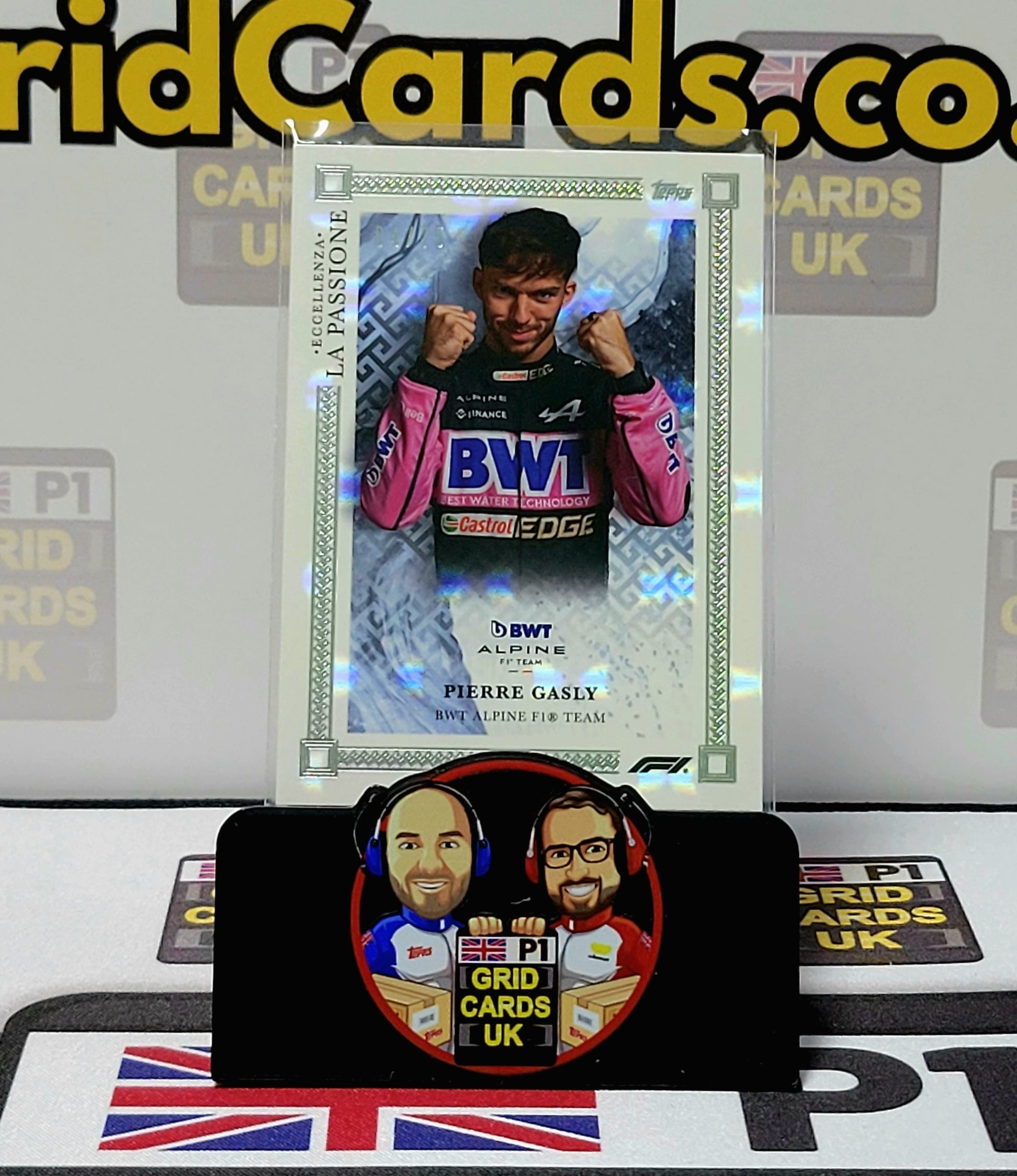 Grey La Passione parallel from the premium Topps Eccellenza F1 2023 release featuring Pierre Gasly. This subset places focus on standout performances, craftsmanship and presentation. Pierre Gasly continues to be a key figure in Formula 1, making numbered cards like this highly desirable among collectors.