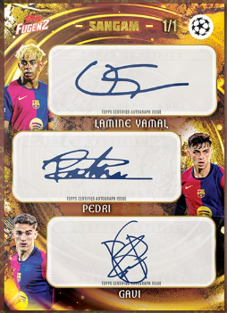 - Triple Threat Autographs: New this year, these cards feature combinations of three top players, including a La Masia triple auto with Lamine Yamal, Pedri, and Gavi.