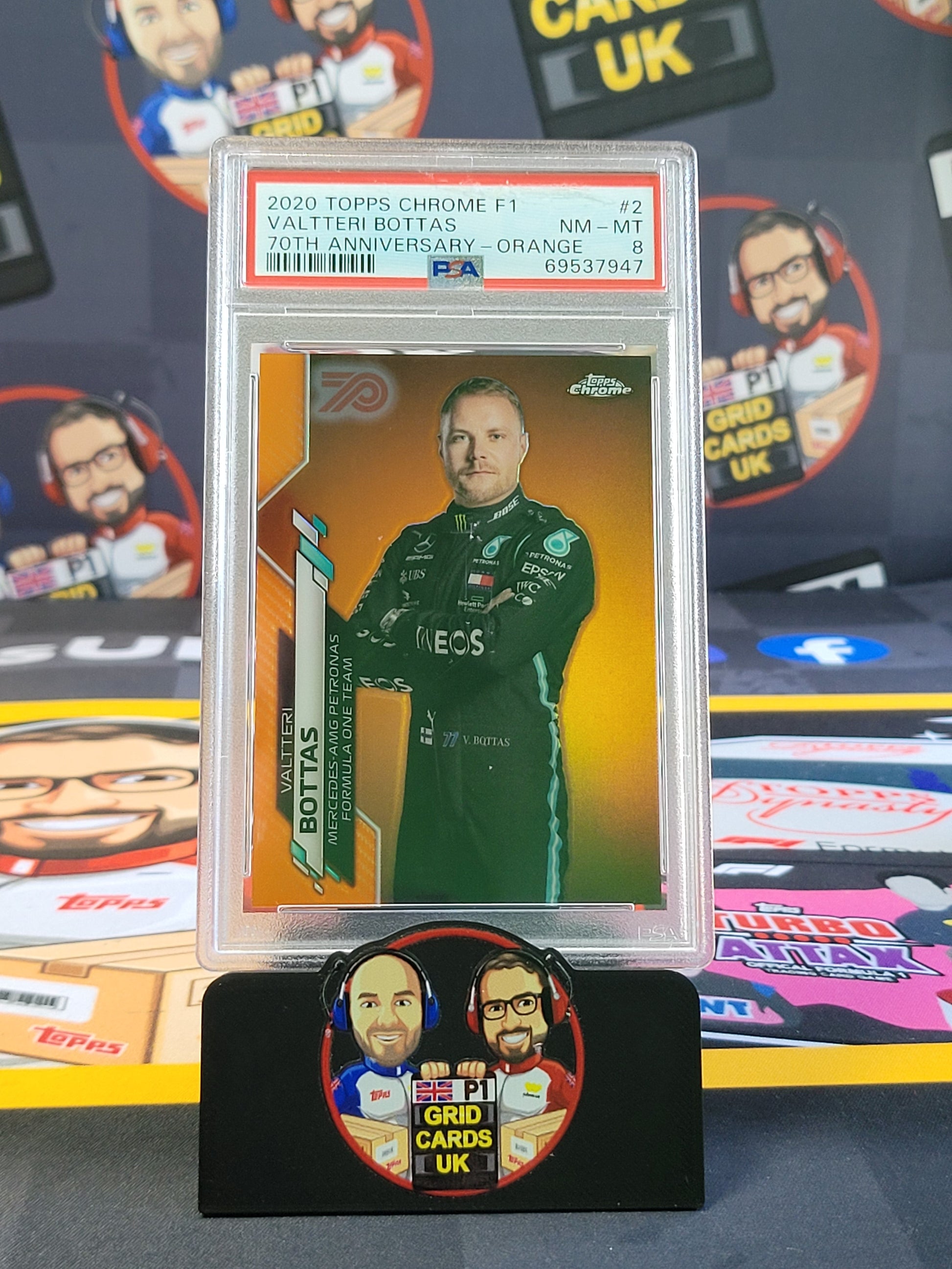 2020 Topps Chrome F1 70th Orange parallel of Valtteri Bottas, PSA 8. Celebrating special color parallels of the Mercedes driver.