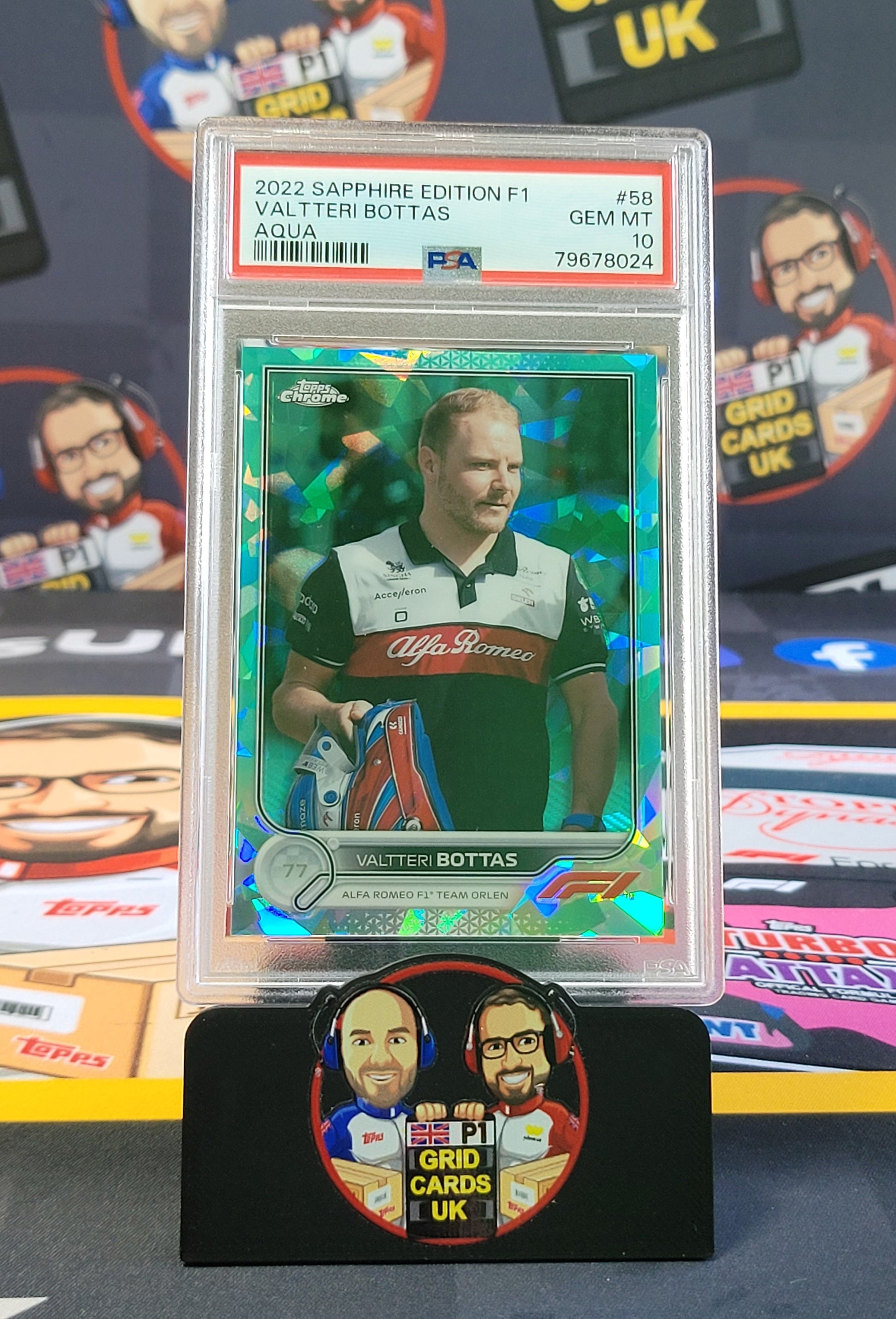 2022 Topps Sapphire F1 Aqua of Valtteri Bottas, PSA 10. Shiny and sharp parallel of the Finnish race winner.