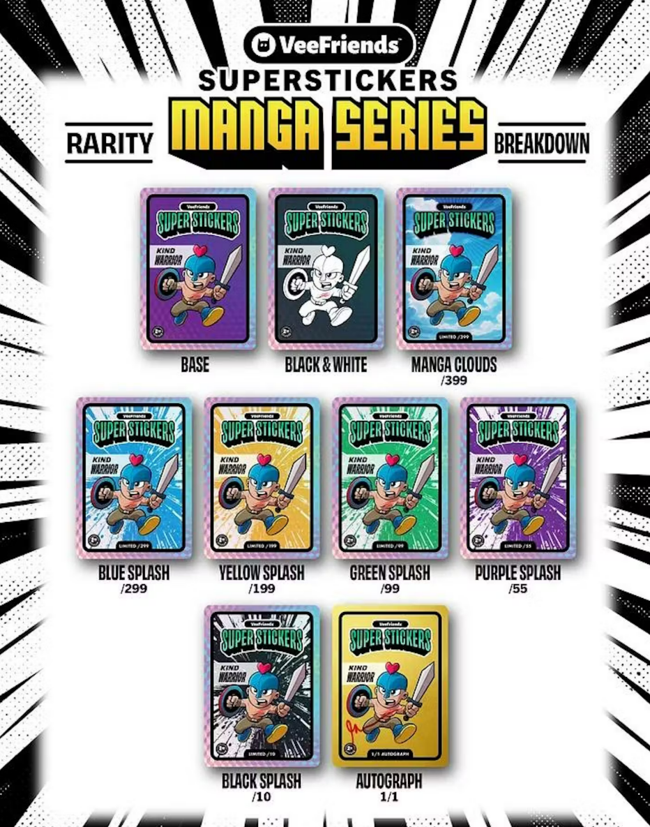 Designed by the VeeFriends creative team with artwork from renowned manga artist LuckyMong, every sticker captures dynamic poses, expressive personalities, and fresh details. Collectors will chase bold new parallels like Manga Clouds (/399), vibrant Splash parallels down to Gold 1/1s, and unique Black & White variations that pay homage to authentic manga styling.